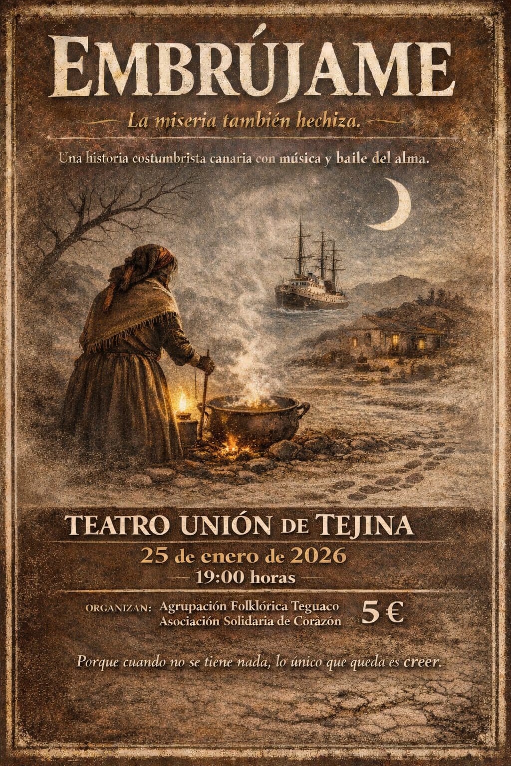 En las Islas Canarias de los años cuarenta, la vida transcurre entre la emigración, la miseria y la fe popular. Embrújame retrata a una comunidad rural donde la brujería, los sueños y la soledad se entrelazan en un drama íntimo, con una estética cargada de poesía visual, simbolismo y emoción. En las Islas Canarias de los años cuarenta, la vida transcurre entre la emigración, la miseria y la fe popular. Embrújame retrata a una comunidad rural donde la brujería, los sueños y la soledad se entrelazan en un drama íntimo, con una estética cargada de poesía visual, simbolismo y emoción.Con el preestreno del nuevo espectáculo, “Ellas”, proponen un concierto familiar que rinde homenaje a la creación femenina en la música, conducido por la narración de Saray Rojas.Un encuentro cercano, sensible y vibrante pensado para compartir entre generaciones, donde niñas, niños y personas adultas disfrutan juntas de un repertorio contemporáneo dedicado a compositoras e intérpretes.Aquí, la experimentación se convierte en juego sonoro y celebración colectiva , situando a la mujer en el corazón de la escena como fuerza creadora y fuente de inspiración.